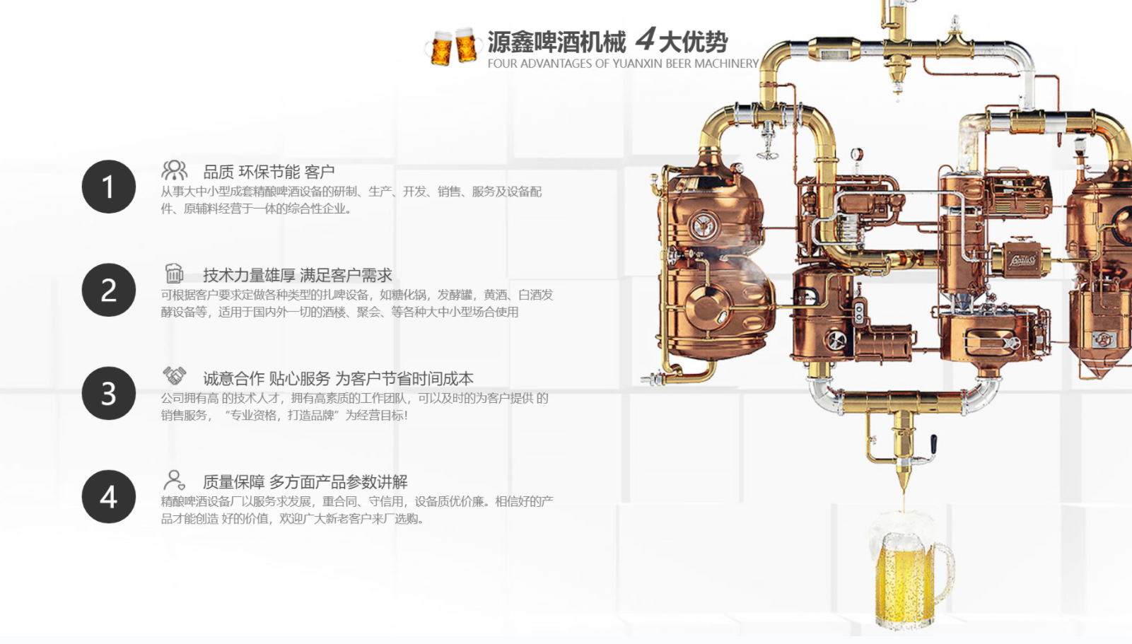 南陽市源鑫啤酒機械設備有限公司位于歷史文化名城一-南陽,從事大中小型成套啤酒、白酒自釀設備的研制、生產、開發(fā)、銷售、服務及設備配件、原輔料經營于一體的綜合性企業(yè)。公司可根據客戶要求定做各種類型的扎啤設備,如糖化鍋,發(fā)酵罐,黃酒、白酒發(fā)酵設備等,適用于國內外一切的酒樓、餐廳、家庭.聚會、酒吧等各種大、中、小型場合使用。公司擁有技術人才,擁有高素質的工作團隊,可以及時的為客戶提供**的銷售服務。公司以“專業(yè)資格,打造品牌”為經營目標,“卓越質量,信賴價格”為經營宗旨,以質量求生存,以服務求發(fā)展,重合同、守信用,設備質優(yōu)價廉。相信好的產品才能創(chuàng)造 好的價值,歡迎廣大新老客戶來廠選購。...
